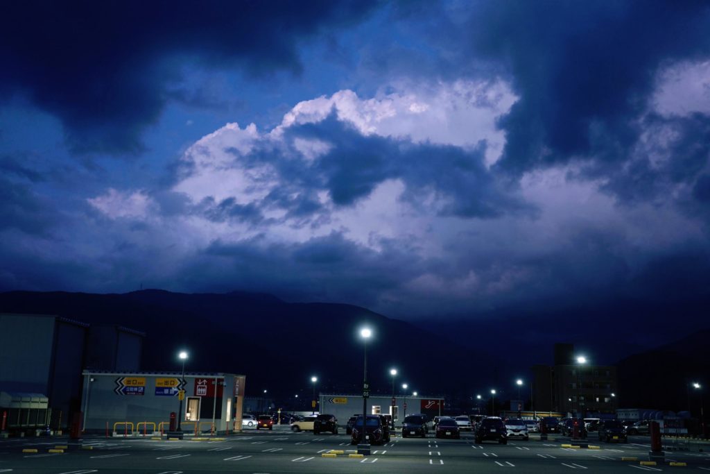 夕方の空。太陽が山に隠れて地上は暗いけど、空はまだ太陽光が当たって明るくなっていました。